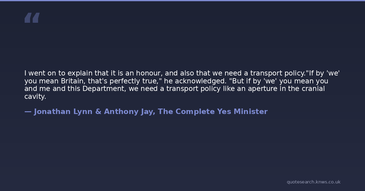 I went on to explain that it is an honour, and also that we need a transport policy."If by 'we' you mean Britain, that's perfectly true," he acknowledged. "But if by 'we' you mean you and me and this Department, we need a transport policy like an aperture in the cranial cavity.