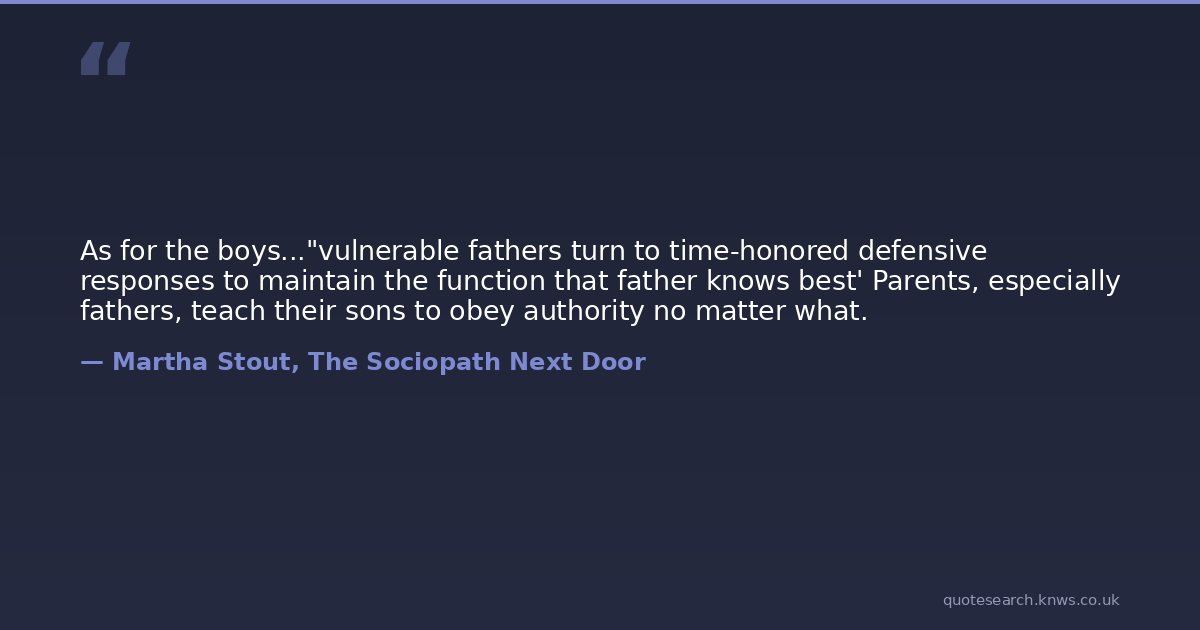 As for the boys..."vulnerable fathers turn to time-honored defensive responses to maintain the function that father knows best' Parents, especially fathers, teach their sons to obey authority no matter what.