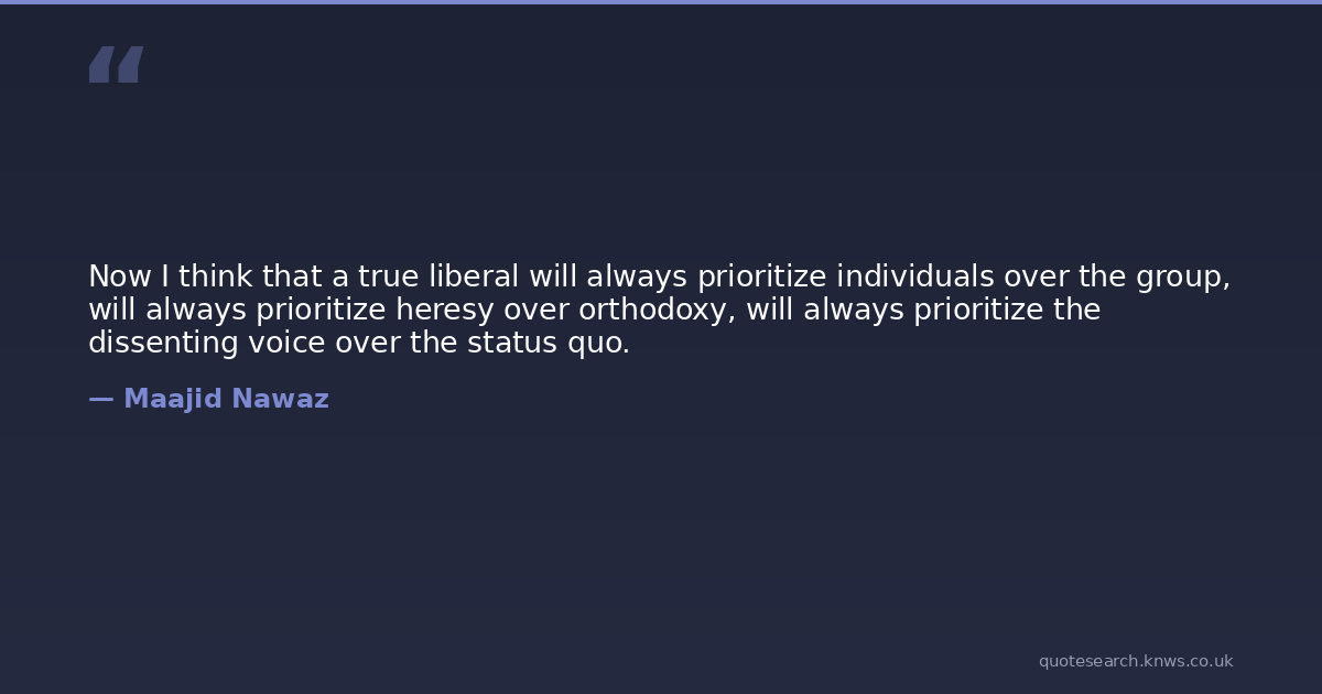 Now I think that a true liberal will always prioritize individuals over the group, will always prioritize heresy over orthodoxy, will always prioritize the dissenting voice over the status quo.