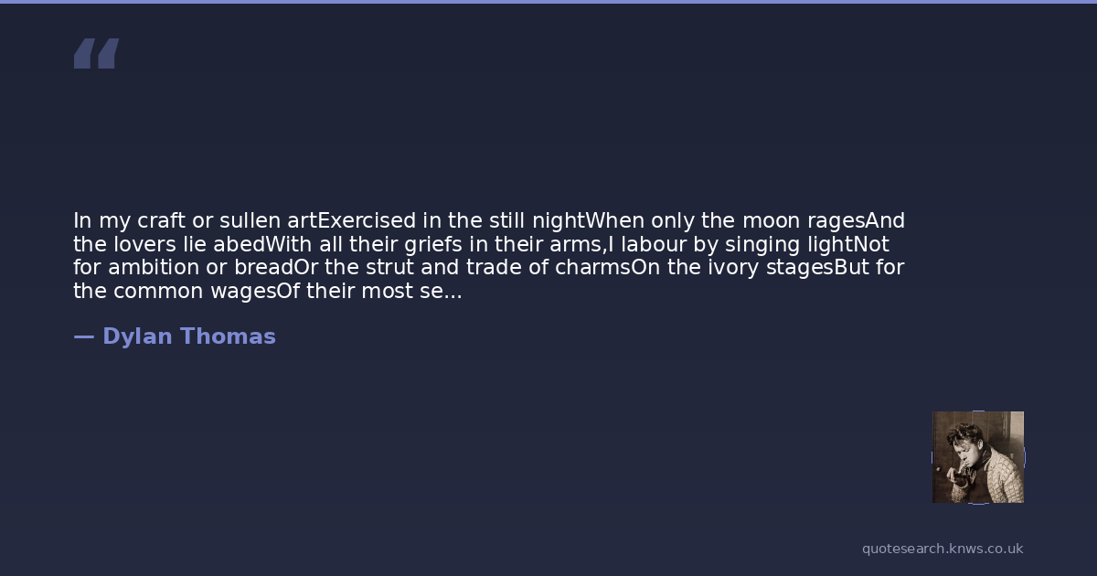 In my craft or sullen artExercised in the still nightWhen only the moon ragesAnd the lovers lie abedWith all their griefs in their arms,I labour by singing lightNot for ambition or breadOr the strut and trade of charmsOn the ivory stagesBut for the common wagesOf their most secret heart.Not for the proud man apartFrom the raging moon I writeOn these spindrift pagesNor for the towering deadWith their nightingales and psalmsBut for the lovers, their armsRound the griefs of the ages,Who pay no praise or wagesNor heed my craft or art.