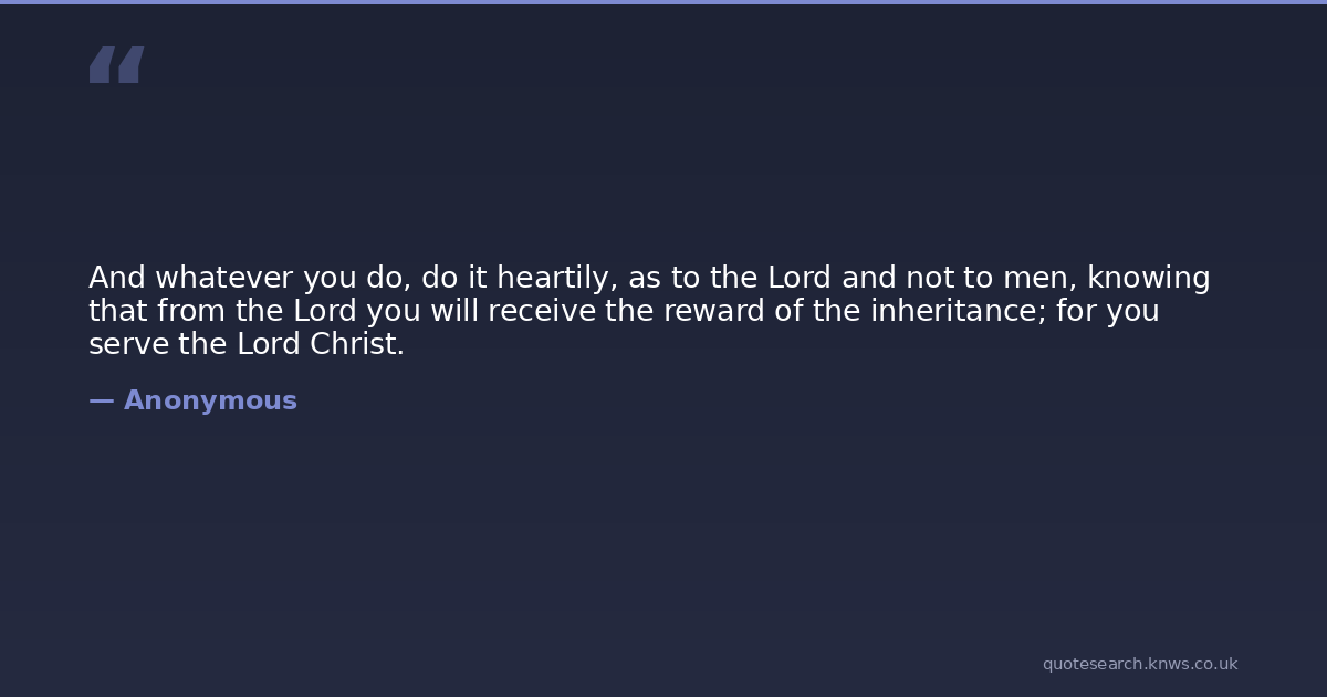 And whatever you do, do it heartily, as to the Lord and not to men, knowing that from the Lord you will receive the reward of the inheritance; for you serve the Lord Christ.
