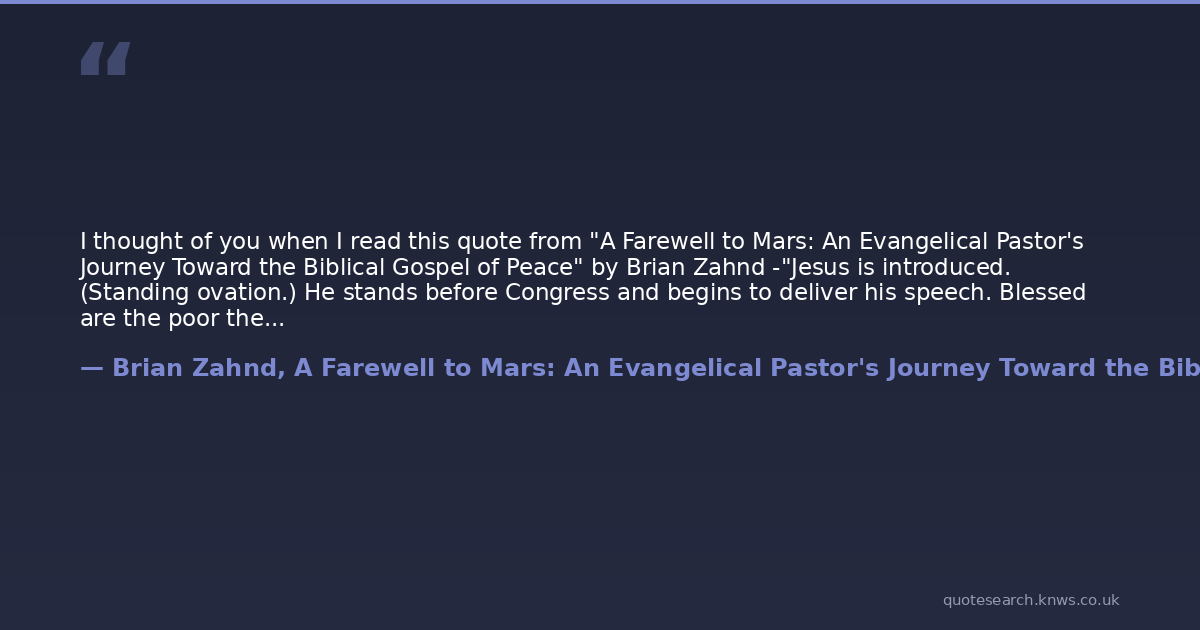 I thought of you when I read this quote from "A Farewell to Mars: An Evangelical Pastor's Journey Toward the Biblical Gospel of Peace" by Brian Zahnd -"Jesus is introduced. (Standing ovation.) He stands before Congress and begins to deliver his speech. Blessed are the poor the mourners the meek. Love your enemies. Turn the other cheek. After a few perfunctory applauses early on, Im pretty sure there would be a lot of squirming senators and uncomfortable congressmen. The room would sink into a tense silence. And when Jesus concluded his speech with a prophecy of the inevitable fall of the house that would not act upon his words (Matt. 7:2627), what would Congress do? Nothing. They would not act. They could not act. To act on Jesuss words would undo their system. The Sermon on the Mount doesnt work in Cains systemno matter how noble or sophisticated. In the end, the US Congress would no more adopt the policies Jesus set out in the Sermon on the Mount than they were adopted by the Jewish Sanhedrin or the Roman Senate.