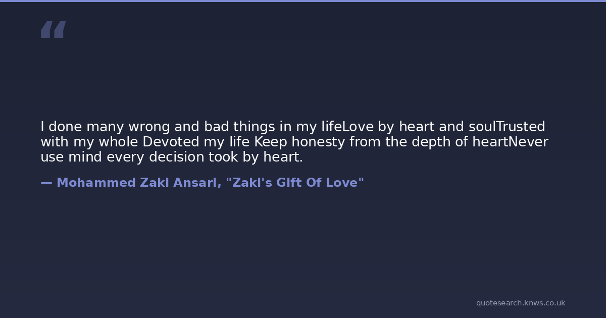 I done many wrong and bad things in my lifeLove by heart and soulTrusted with my whole Devoted my life Keep honesty from the depth of heartNever use mind every decision took by heart.