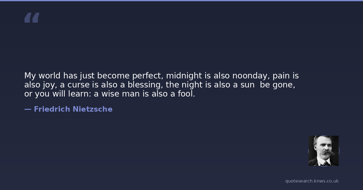 My world has just become perfect, midnight is also noonday, pain is also joy, a curse is also a blessing, the night is also a sun be gone, or you will learn: a wise man is also a fool.