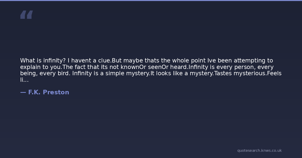 What is infinity? I havent a clue.But maybe thats the whole point Ive been attempting to explain to you.The fact that its not knownOr seenOr heard.Infinity is every person, every being, every bird. Infinity is a simple mystery.It looks like a mystery.Tastes mysterious.Feels like something completely delirious. We cannot imagine what this sound could be.All we can imagine is infinity.