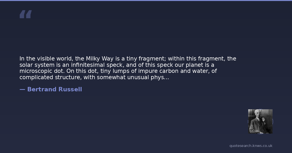 In the visible world, the Milky Way is a tiny fragment; within this fragment, the solar system is an infinitesimal speck, and of this speck our planet is a microscopic dot. On this dot, tiny lumps of impure carbon and water, of complicated structure, with somewhat unusual physical and chemical properties, crawl about for a few years, until they are dissolved again into the elements of which they are compounded.
