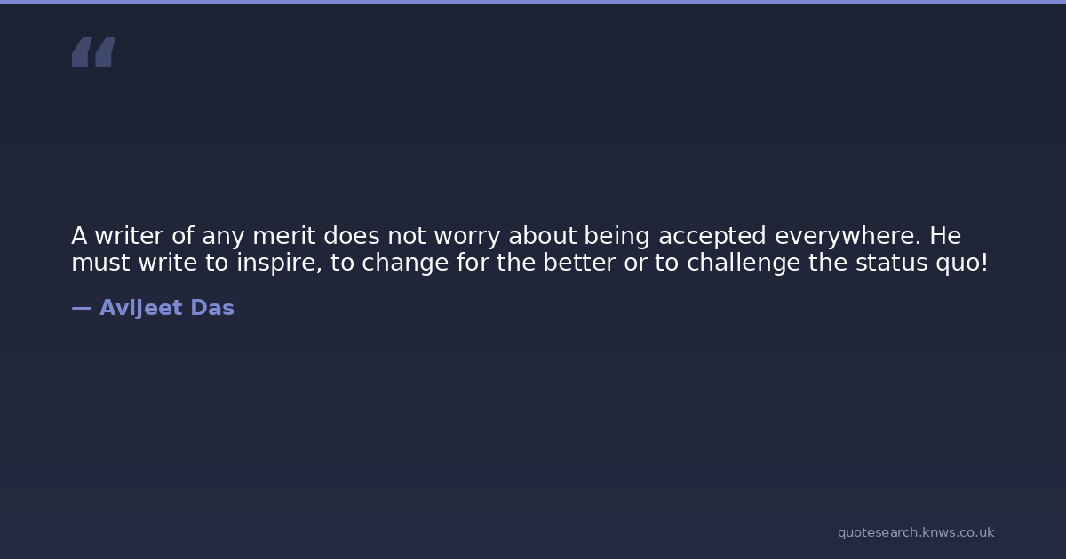 A writer of any merit does not worry about being accepted everywhere. He must write to inspire, to change for the better or to challenge the status quo!