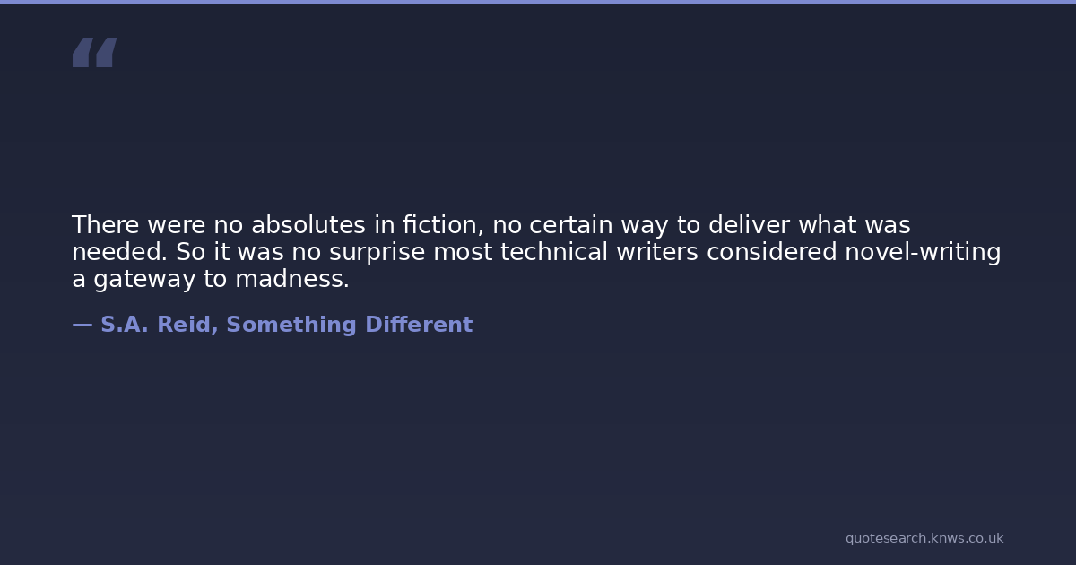 There were no absolutes in fiction, no certain way to deliver what was needed. So it was no surprise most technical writers considered novel-writing a gateway to madness.