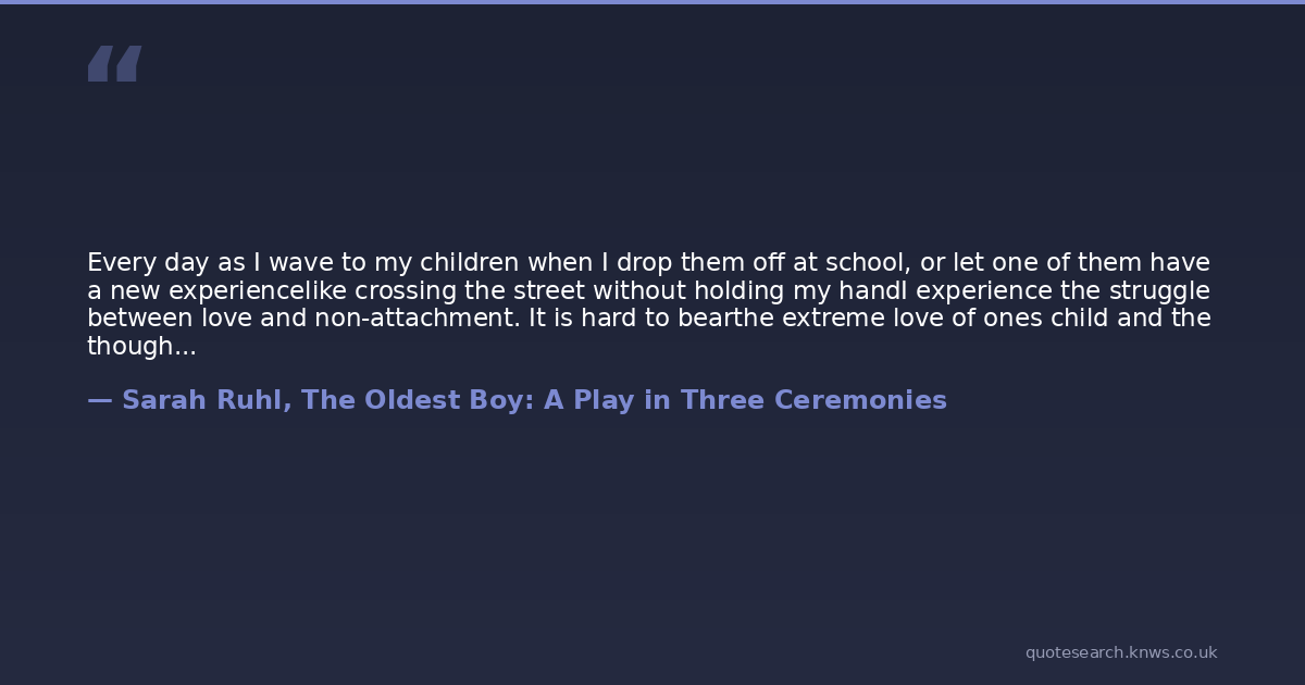 Every day as I wave to my children when I drop them off at school, or let one of them have a new experiencelike crossing the street without holding my handI experience the struggle between love and non-attachment. It is hard to bearthe extreme love of ones child and the thought that ultimately the child belongs to the world. There is this horrible design flawchildren are supposed to grow up and away from you; and one of you will die first.
