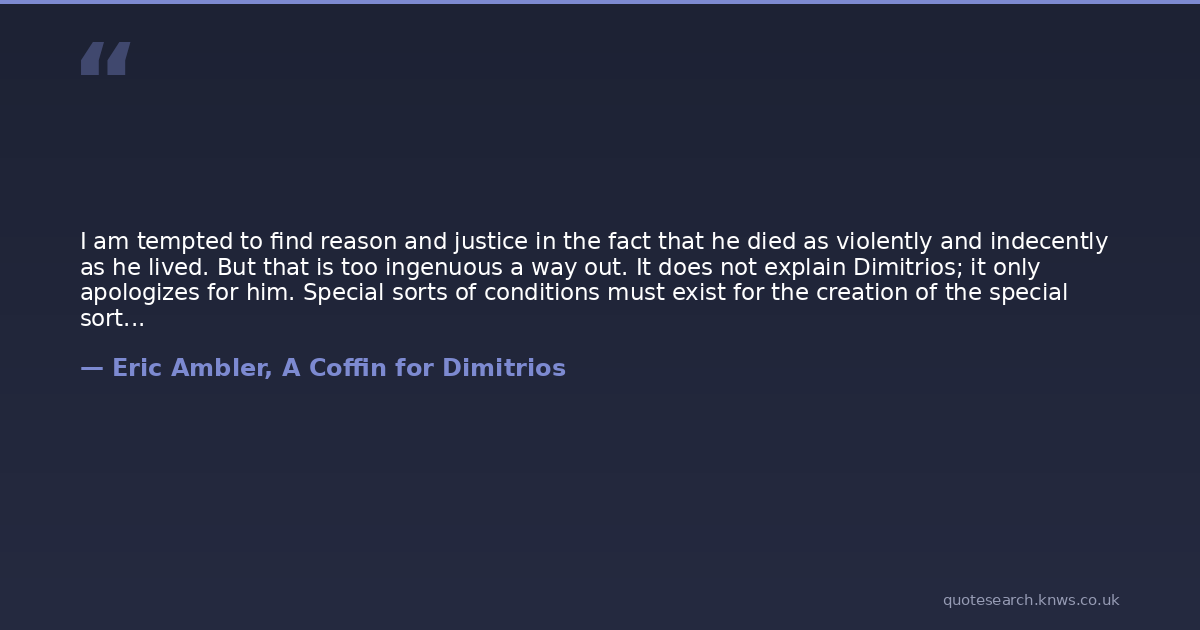 I am tempted to find reason and justice in the fact that he died as violently and indecently as he lived. But that is too ingenuous a way out. It does not explain Dimitrios; it only apologizes for him. Special sorts of conditions must exist for the creation of the special sort of criminal that he typified...all I do know is that while might is right, while chaos and anarchy masquerade as order and enlightenment, those conditions will obtain.