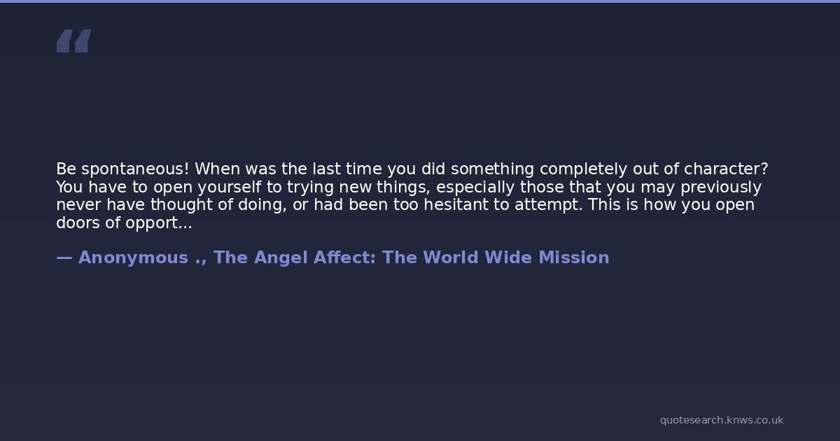 Be spontaneous! When was the last time you did something completely out of character? You have to open yourself to trying new things, especially those that you may previously never have thought of doing, or had been too hesitant to attempt. This is how you open doors of opportunity for positive growth. When we try new experiences, we allow ourselves to feel again. Everything in life cant be planned. Sometimes you just need to let your hair down and live in the moment. Being spontaneous will keep your life interesting and exciting. So instead of saying no, start saying yes!