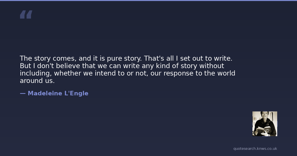 The story comes, and it is pure story. That's all I set out to write. But I don't believe that we can write any kind of story without including, whether we intend to or not, our response to the world around us.