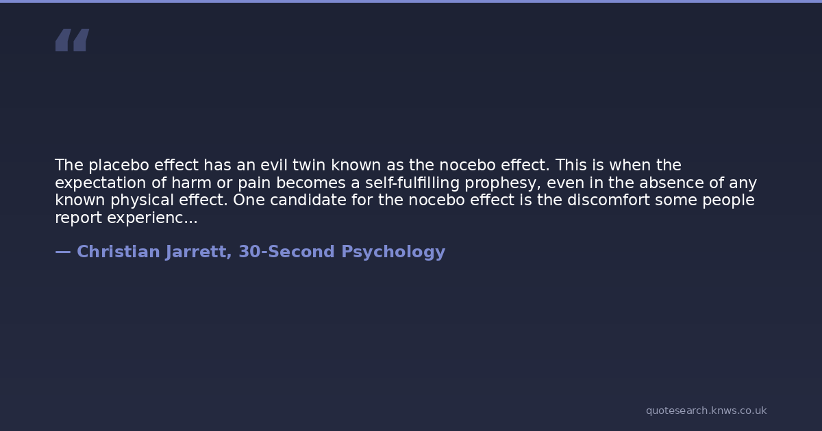 The placebo effect has an evil twin known as the nocebo effect. This is when the expectation of harm or pain becomes a self-fulfilling prophesy, even in the absence of any known physical effect. One candidate for the nocebo effect is the discomfort some people report experiencing after using mobile phones. Scientists have failed to identify a physical cause, so it's possible the adverse effects are caused by negative beliefs about the technology.