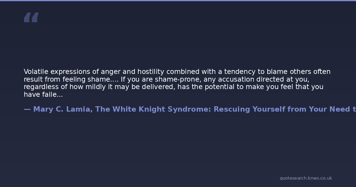 Volatile expressions of anger and hostility combined with a tendency to blame others often result from feeling shame.... If you are shame-prone, any accusation directed at you, regardless of how mildly it may be delivered, has the potential to make you feel that you have failed or that you are inadequate. Rather than simply admit wrongdoing, you get angry and accusatory in order to hold yourself blameless. Using anger or hostility for self-protection hides your vulnerability and needs. Unfortunately, since most people are repelled by an angry response, this method may be effective. Your anger may drive away the very people who should know your real feelings, and it may deprive you of the opportunity to allow others to be aware of your needs. Behaving in an offensive or frightening way toward others can cause them to retreat out of fear. But, actually, the fear is your own, which you have turned against someone else in the form of anger.