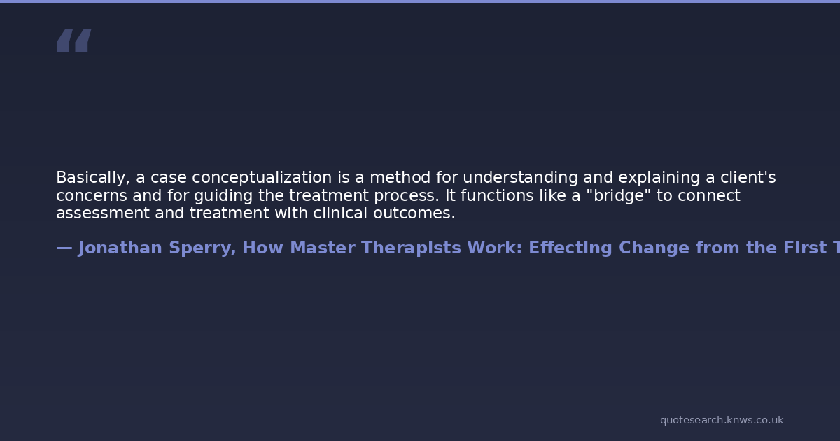 Basically, a case conceptualization is a method for understanding and explaining a client's concerns and for guiding the treatment process. It functions like a "bridge" to connect assessment and treatment with clinical outcomes.
