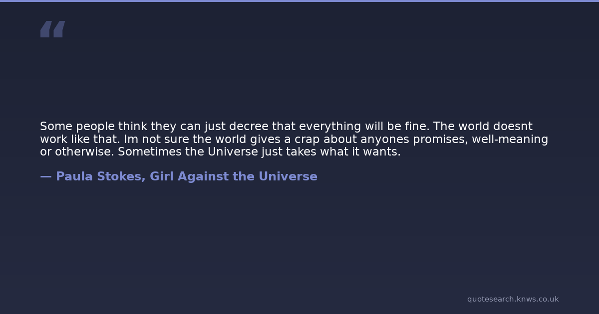 Some people think they can just decree that everything will be fine. The world doesnt work like that. Im not sure the world gives a crap about anyones promises, well-meaning or otherwise. Sometimes the Universe just takes what it wants.