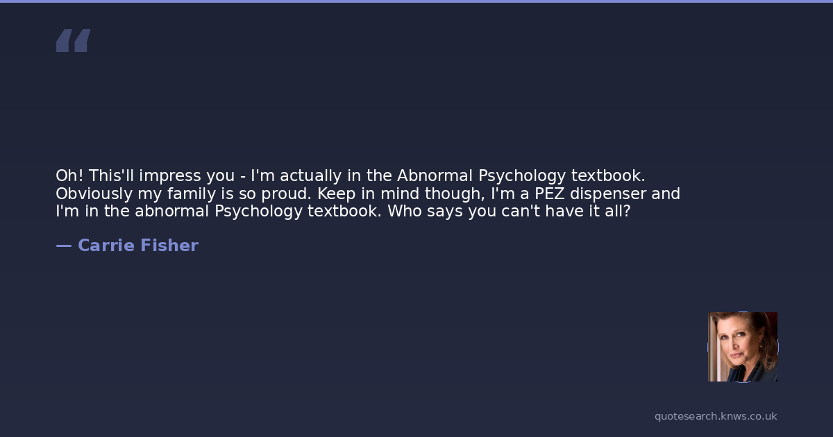 Oh! This'll impress you - I'm actually in the Abnormal Psychology textbook. Obviously my family is so proud. Keep in mind though, I'm a PEZ dispenser and I'm in the abnormal Psychology textbook. Who says you can't have it all?