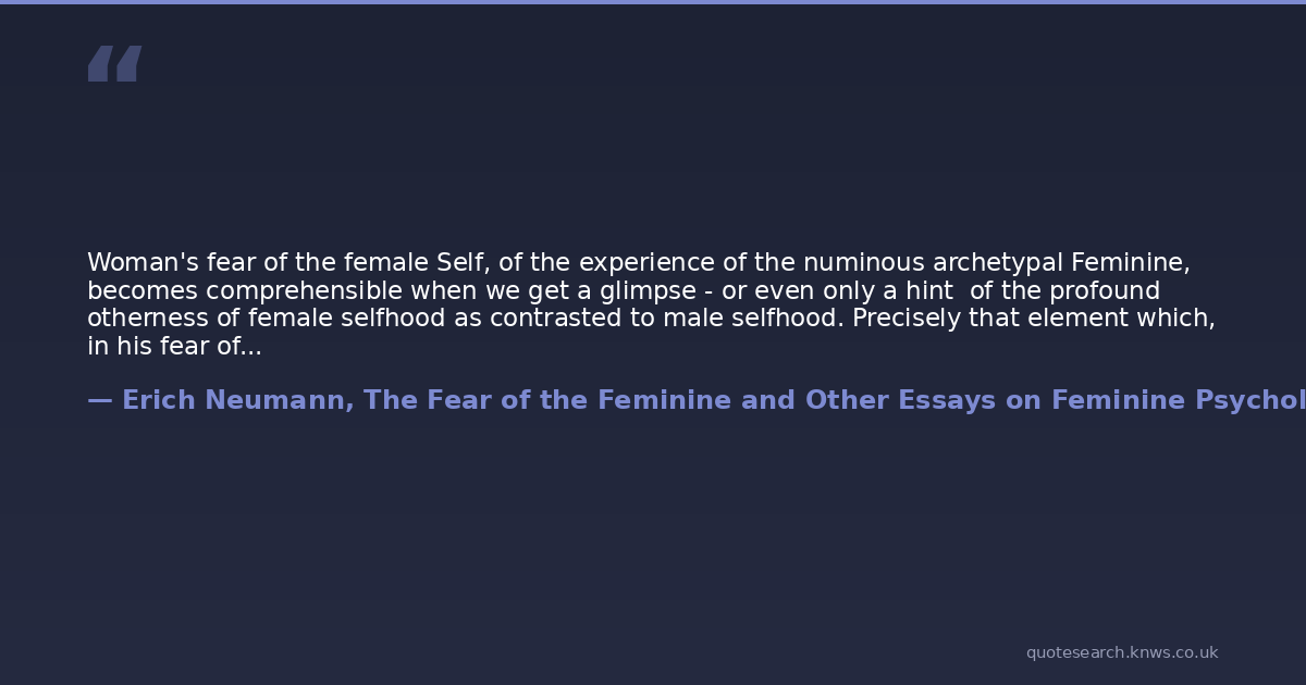 Woman's fear of the female Self, of the experience of the numinous archetypal Feminine, becomes comprehensible when we get a glimpse - or even only a hint of the profound otherness of female selfhood as contrasted to male selfhood. Precisely that element which, in his fear of the Feminine, the male experiences as the hole, abyss, void, and nothingness turns into something positive for the woman without, however, losing these same characteristics. Here the archetypal Feminine is experienced not as illusion and as maya but rather as unfathomable reality and as life in which above and below, spiritual and physical, are not pitted against each other; reality as eternity is creative and, at the same time, is grounded in primeval nothingness. Hence as daughter the woman experiences herself as belonging to the female spiritual figure Sophia, the highest wisdom, while at the same time she is actualizing her connection with the musty, sultry, bloody depths of swamp-mother Earth. However, in this sort of Self-discovery woman necessarily comes to see herself as different from what presents itself to men -as, for example, spirit and father, but often also as the patriarchal godhead and his ethics. The basic phenomenon - that the human being is born of woman and reared by her during the crucial developmental phases - is expressed in woman as a sense of connectedness with all living things, a sense not yet sufficiently realized, and one that men, and especially the patriarchal male, absolutely lack to the extent women have it.To experience herself as so fundamentally different from the dominant patriarchal values understandably fills the woman with fear until she arrives at that point in her own development where, through experience and love that binds the opposites, she can clearly see the totality of humanity as a unity of masculine and feminine aspects of the Self.