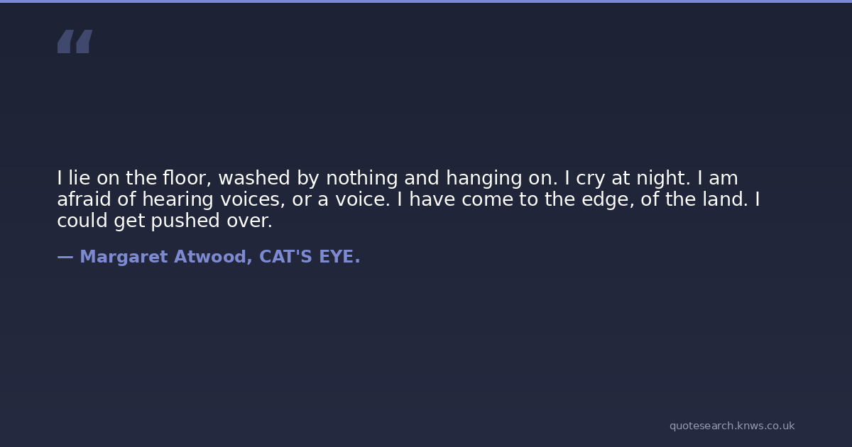 I lie on the floor, washed by nothing and hanging on. I cry at night. I am afraid of hearing voices, or a voice. I have come to the edge, of the land. I could get pushed over.