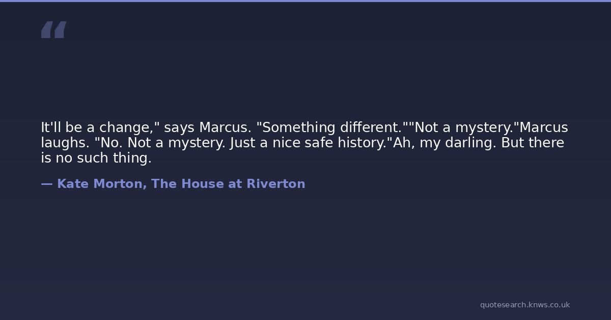 It'll be a change," says Marcus. "Something different.""Not a mystery."Marcus laughs. "No. Not a mystery. Just a nice safe history."Ah, my darling. But there is no such thing.