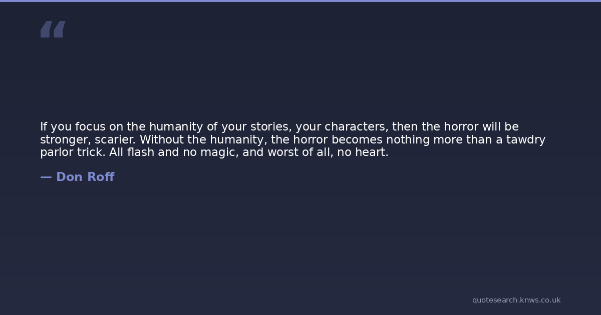 If you focus on the humanity of your stories, your characters, then the horror will be stronger, scarier. Without the humanity, the horror becomes nothing more than a tawdry parlor trick. All flash and no magic, and worst of all, no heart.