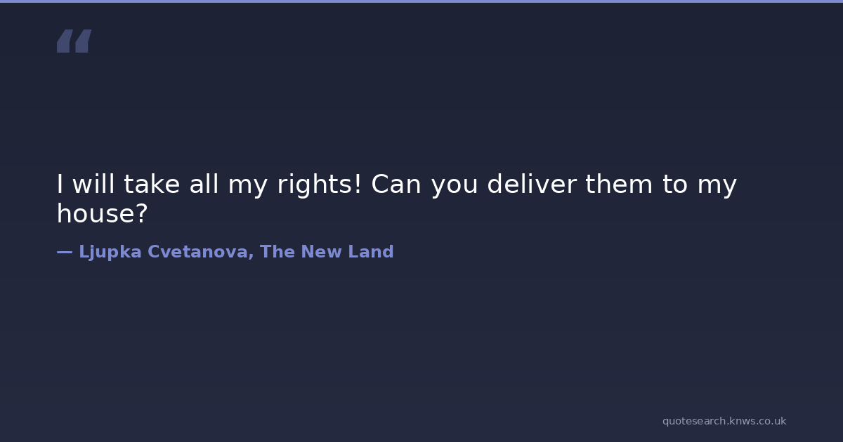 I will take all my rights! Can you deliver them to my house? aphorism deliver deliver-to-my-house delivery falsehood funny-quote humorous-quotes irony my-right pretentious pretentious-people quote right rights sarcasm saying Download Image Share on X Share on Facebook Copy Link