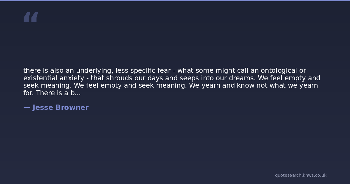 there is also an underlying, less specific fear - what some might call an ontological or existential anxiety - that shrouds our days and seeps into our dreams. We feel empty and seek meaning. We feel empty and seek meaning. We yearn and know not what we yearn for. There is a black hole at the center of our understanding that engulfs and crushes our every attempt to explore it. Something is missing.