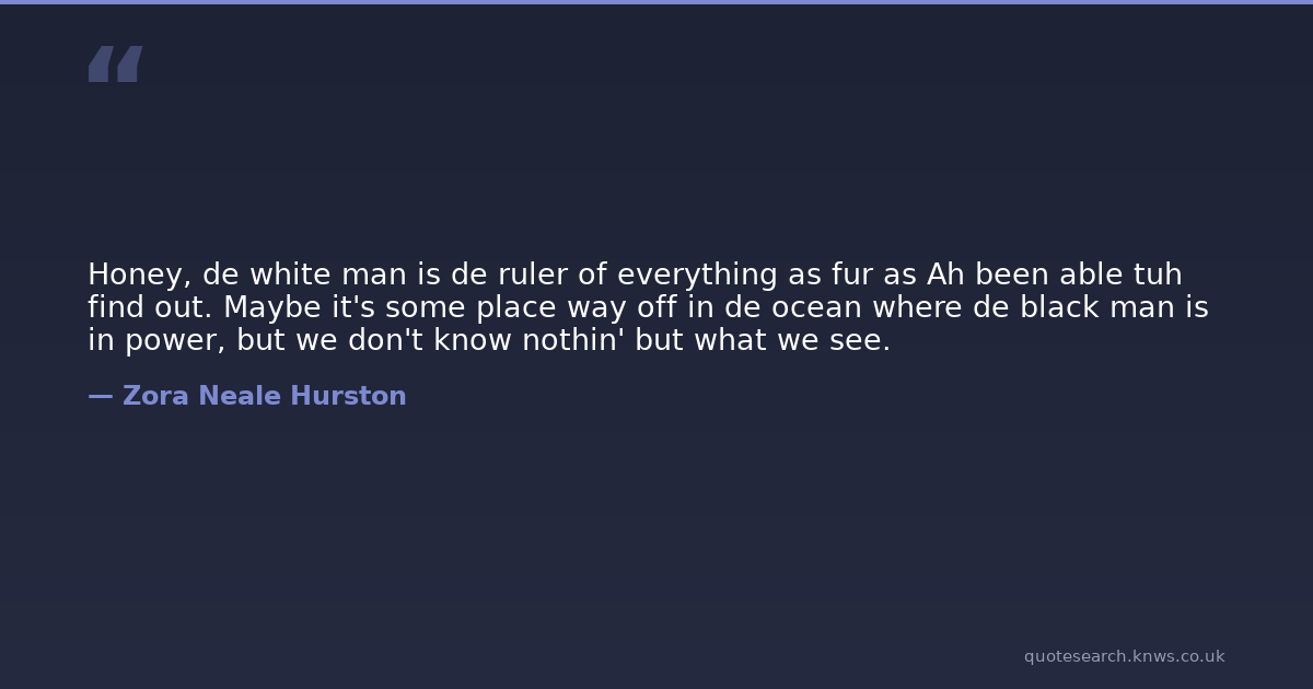 Honey, de white man is de ruler of everything as fur as Ah been able tuh find out. Maybe it's some place way off in de ocean where de black man is in power, but we don't know nothin' but what we see.