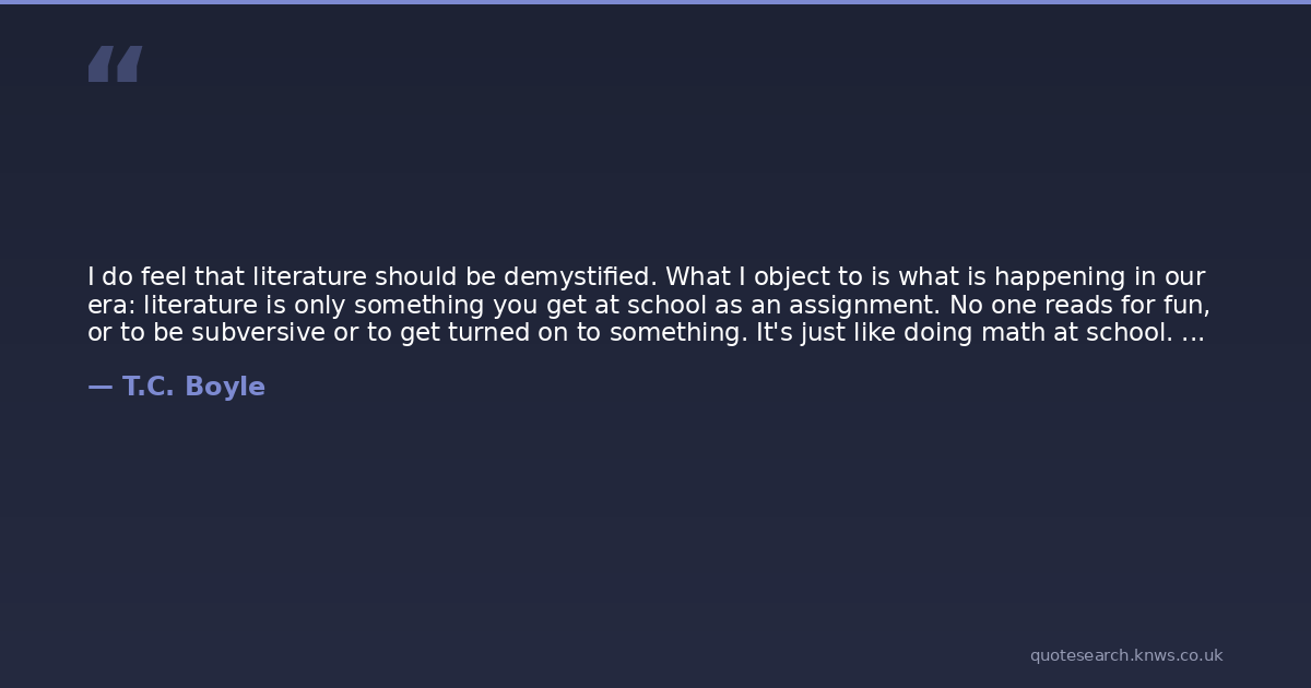 I do feel that literature should be demystified. What I object to is what is happening in our era: literature is only something you get at school as an assignment. No one reads for fun, or to be subversive or to get turned on to something. It's just like doing math at school. I mean, how often do we sit down and do trigonometry for fun, to relax. I've thought about this, the domination of the literary arts by theory over the past 25 years -- which I detest -- and it's as if you have to be a critic to mediate between the author and the reader and that's utter crap. Literature can be great in all ways, but it's just entertainment like rock'n'roll or a film. It is entertainment. If it doesn't capture you on that level, as entertainment, movement of plot, then it doesn't work. Nothing else will come out of it. The beauty of the language, the characterisation, the structure, all that's irrelevant if you're not getting the reader on that level -- moving a story. If that's friendly to readers, I cop to it.