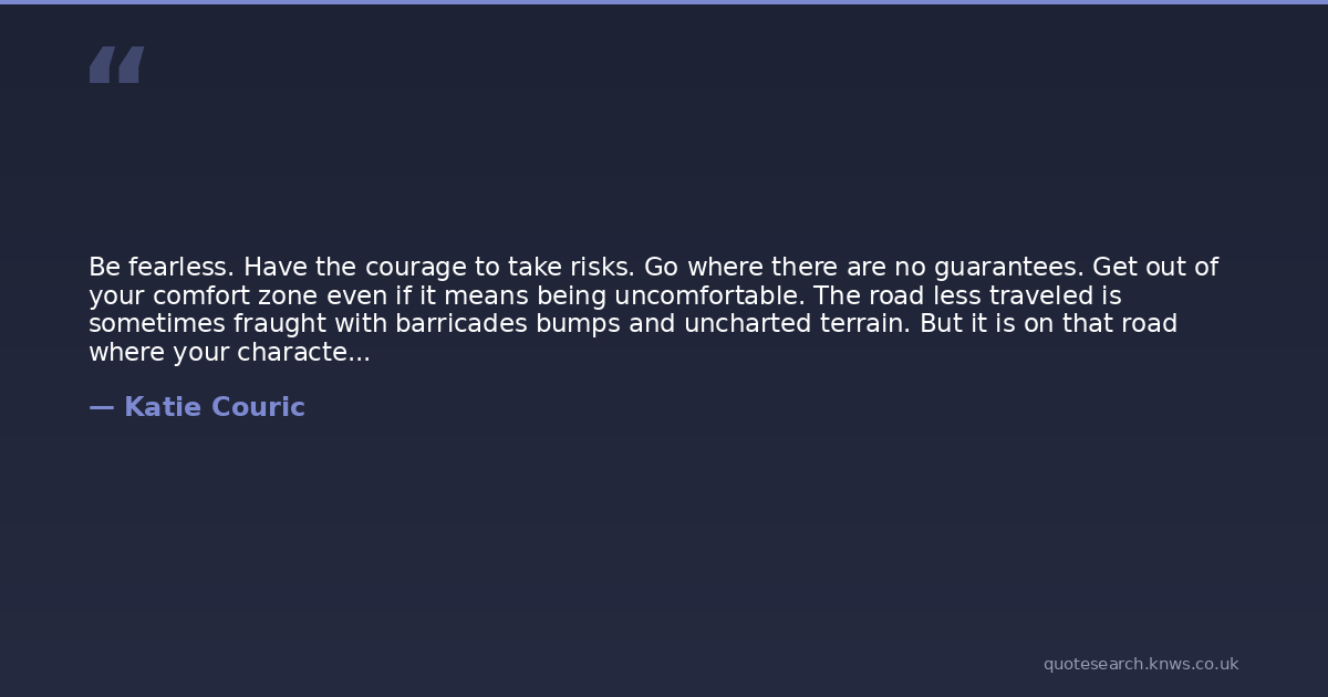 Be fearless. Have the courage to take risks. Go where there are no guarantees. Get out of your comfort zone even if it means being uncomfortable. The road less traveled is sometimes fraught with barricades bumps and uncharted terrain. But it is on that road where your character is truly tested And have the courage to accept that youre not perfect nothing is and no one is and thats OK.