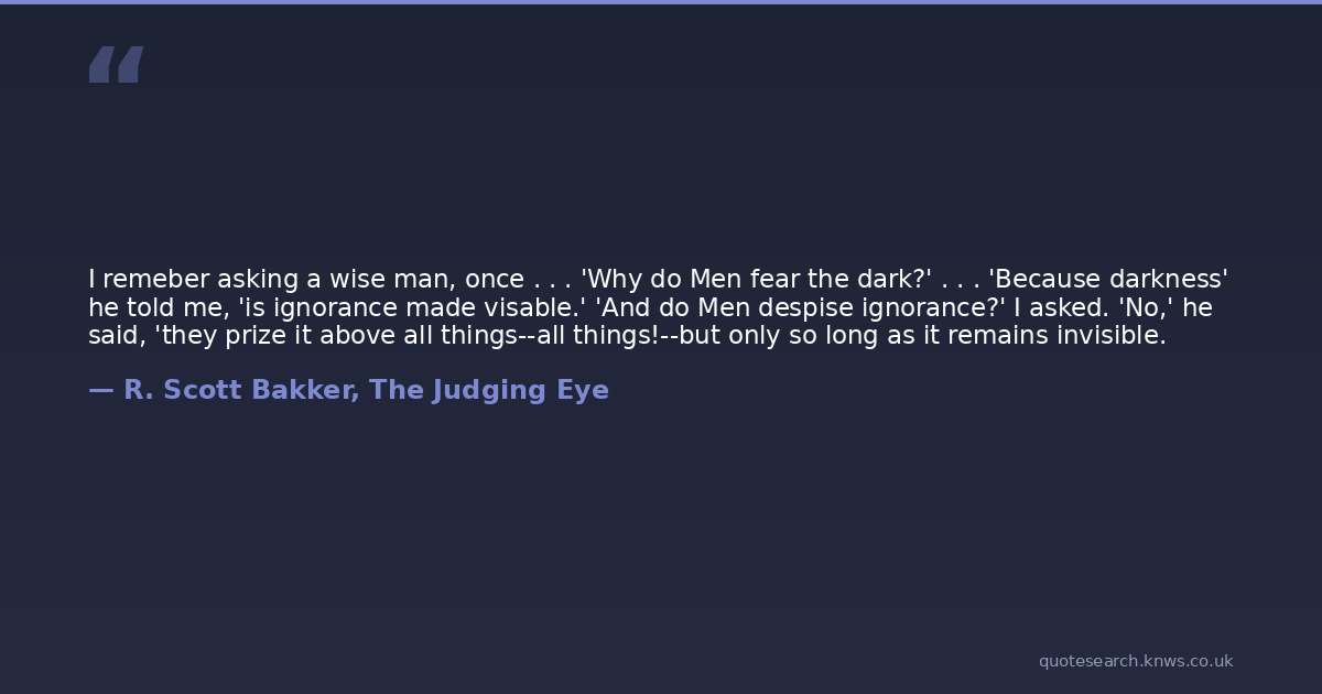 I remeber asking a wise man, once . . . 'Why do Men fear the dark?' . . . 'Because darkness' he told me, 'is ignorance made visable.' 'And do Men despise ignorance?' I asked. 'No,' he said, 'they prize it above all things--all things!--but only so long as it remains invisible.