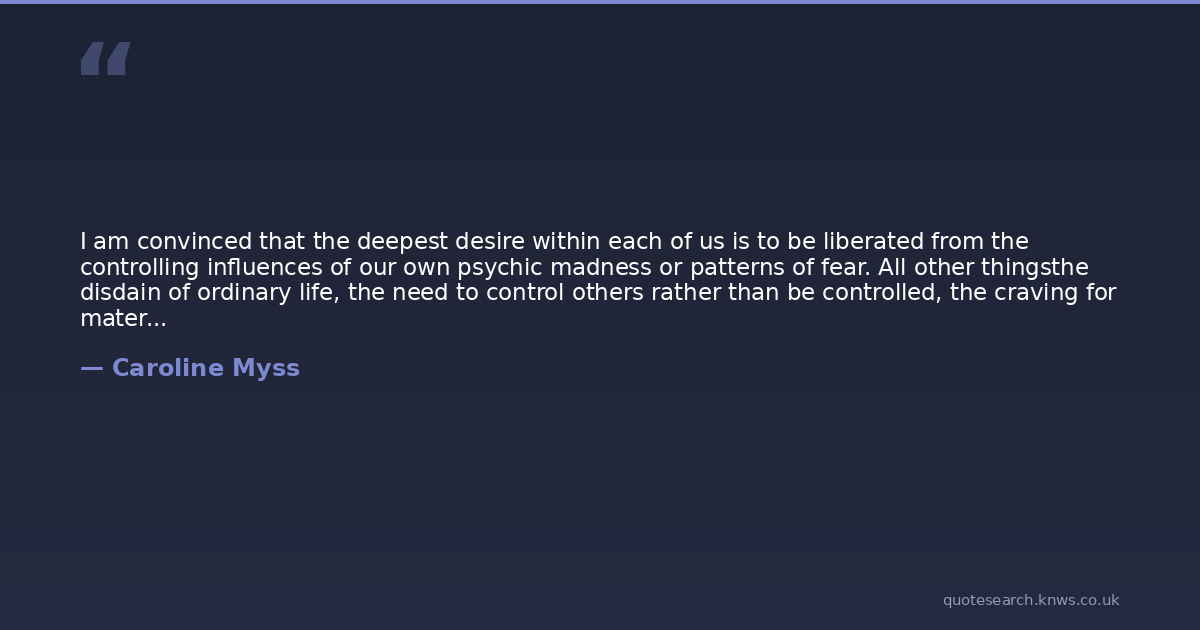I am convinced that the deepest desire within each of us is to be liberated from the controlling influences of our own psychic madness or patterns of fear. All other thingsthe disdain of ordinary life, the need to control others rather than be controlled, the craving for material goods as a means of security and protection against the winds of chaosare external props that serve as substitutes for the real battle, which is the one waged within the individual soul.