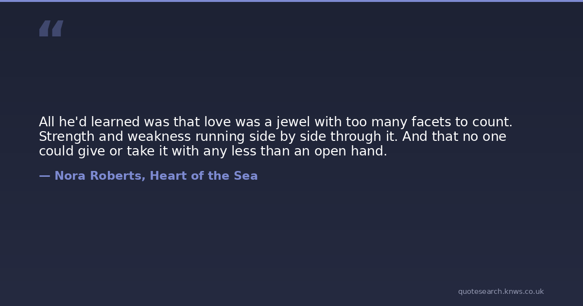 All he'd learned was that love was a jewel with too many facets to count. Strength and weakness running side by side through it. And that no one could give or take it with any less than an open hand.
