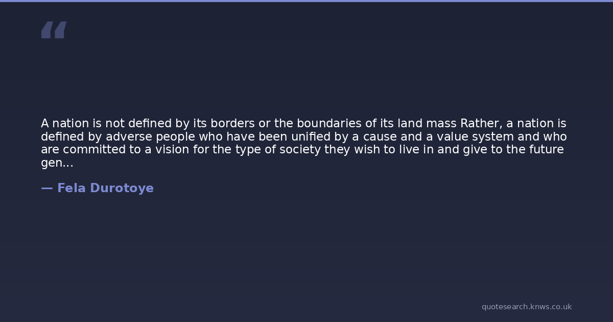 A nation is not defined by its borders or the boundaries of its land mass Rather, a nation is defined by adverse people who have been unified by a cause and a value system and who are committed to a vision for the type of society they wish to live in and give to the future generations to come.