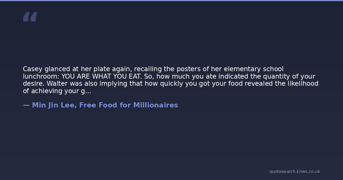 Casey glanced at her plate again, recalling the posters of her elementary school lunchroom: YOU ARE WHAT YOU EAT. So, how much you ate indicated the quantity of your desire. Walter was also implying that how quickly you got your food revealed the likelihood of achieving your goals. She was in fact terribly hungry, but she'd pretended to be otherwise to be ladylike and had moved away from the table to be agreeable, and now she'd continue to be hungry" (Free Food For Millionaires, p.92.)