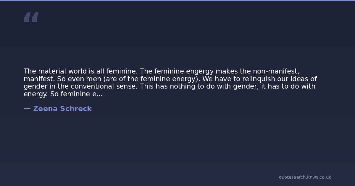 The material world is all feminine. The feminine engergy makes the non-manifest, manifest. So even men (are of the feminine energy). We have to relinquish our ideas of gender in the conventional sense. This has nothing to do with gender, it has to do with energy. So feminine energy is what creates and allows anything which is non-manifest, like an idea, to come into form, into being, to be born. All that we experience in the world around us, absolutely everything (is feminine energy). The only way that anything exists is through the feminine force.