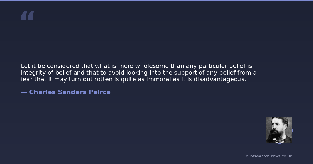 Let it be considered that what is more wholesome than any particular belief is integrity of belief and that to avoid looking into the support of any belief from a fear that it may turn out rotten is quite as immoral as it is disadvantageous.