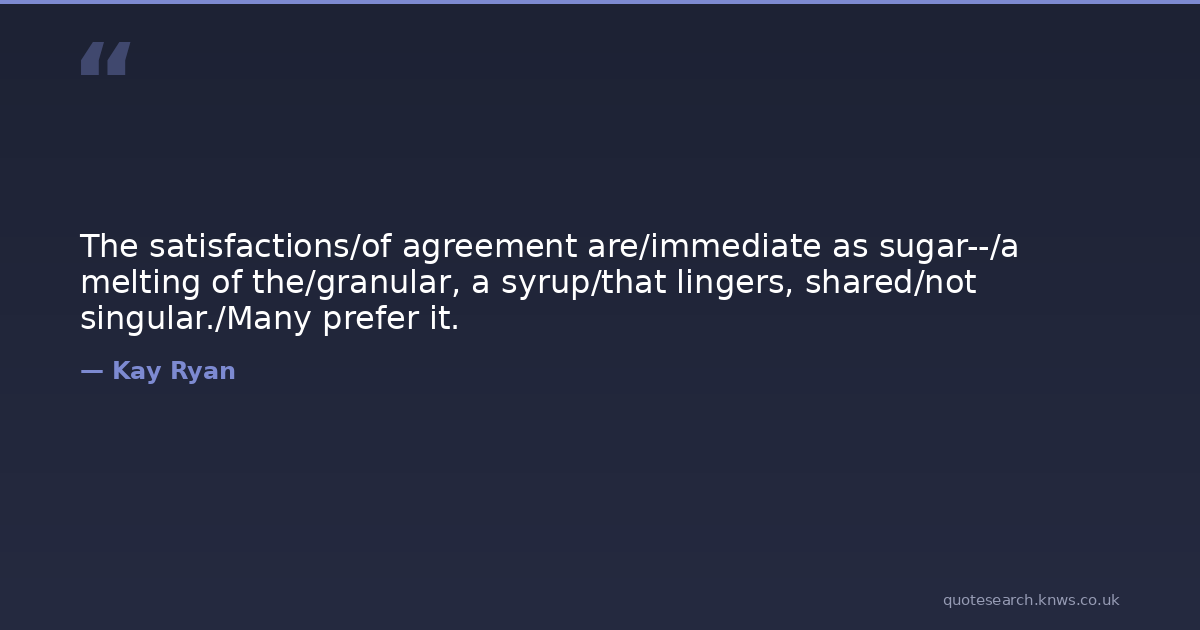 The satisfactions/of agreement are/immediate as sugar--/a melting of the/granular, a syrup/that lingers, shared/not singular./Many prefer it.