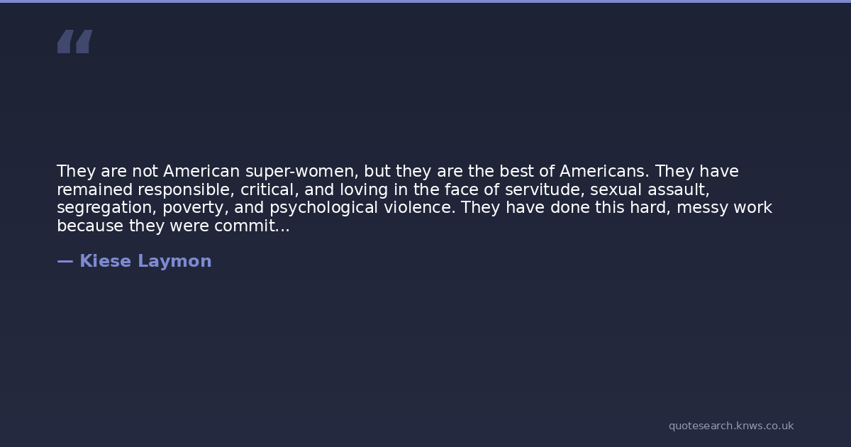 They are not American super-women, but they are the best of Americans. They have remained responsible, critical, and loving in the face of servitude, sexual assault, segregation, poverty, and psychological violence. They have done this hard, messy work because they were committed to life and justice, and so we all might live more responsibly tomorrow.