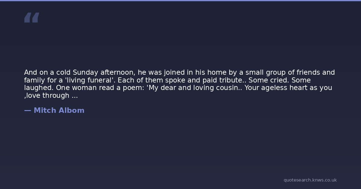 And on a cold Sunday afternoon, he was joined in his home by a small group of friends and family for a 'living funeral'. Each of them spoke and paid tribute.. Some cried. Some laughed. One woman read a poem: 'My dear and loving cousin.. Your ageless heart as you ,love through time, layer on layer, tender sequoia..' .. And all the heartfelt things we never get to say to those we love, Morrie said that day.