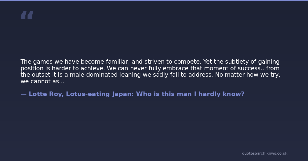 The games we have become familiar, and striven to compete. Yet the subtlety of gaining position is harder to achieve. We can never fully embrace that moment of success...from the outset it is a male-dominated leaning we sadly fail to address. No matter how we try, we cannot assimilate. On principle we are not one of them.