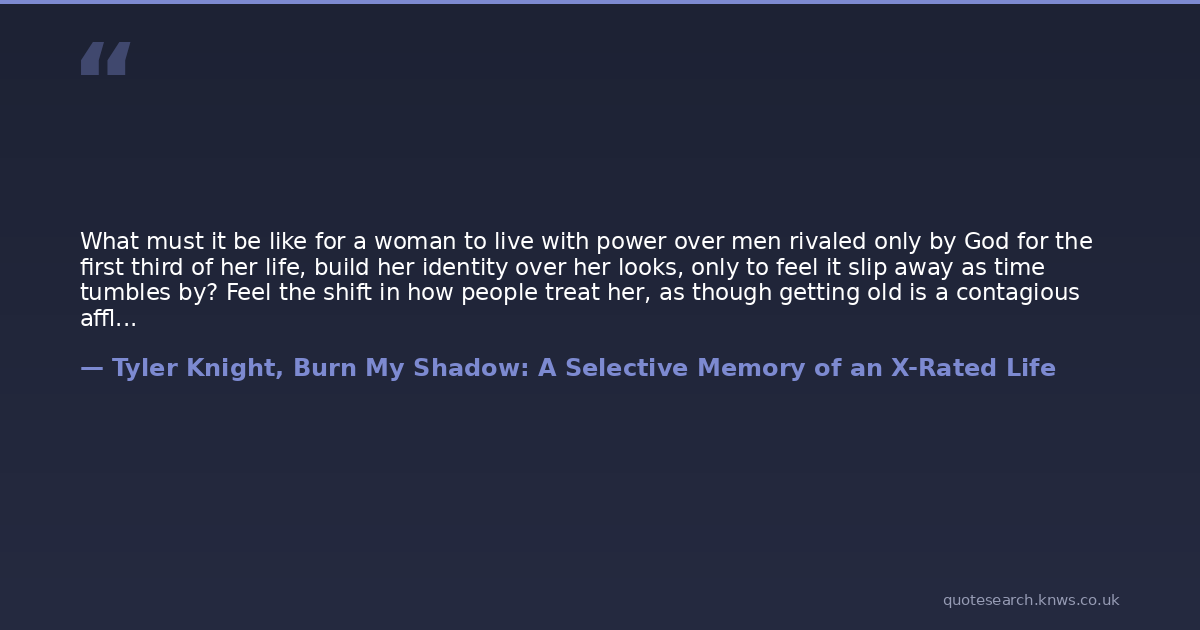 What must it be like for a woman to live with power over men rivaled only by God for the first third of her life, build her identity over her looks, only to feel it slip away as time tumbles by? Feel the shift in how people treat her, as though getting old is a contagious affliction?